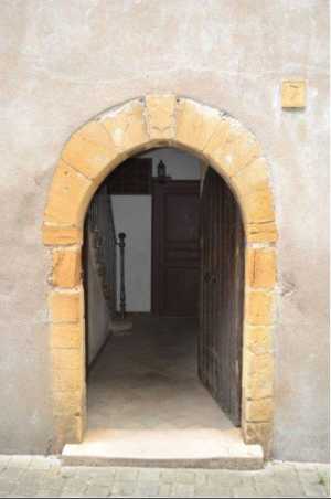 Porte en pierre jaune en plein cintre avec clé centrale débordante (16e siècle)